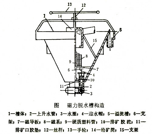 磁力脫水槽內(nèi)磁場特性應(yīng)在軸向和徑向都有梯度。在相同的條件下,軸向梯度大,徑向梯度小時,磁性礦粒下降的速度較快,對提高處理能力有利。反之,徑向梯度大,軸向梯度小時,磁鏈往往呈水平或近似水平狀態(tài)下降,所受到的上升水流阻力大,礦粒的沉降速度慢,影響處理能力,但此時磁鏈在下降過程中能受到較好的沖洗作用,對提高精礦質(zhì)量有利,故應(yīng)根據(jù)磁力脫水槽的不同用途來考慮磁性特點。
