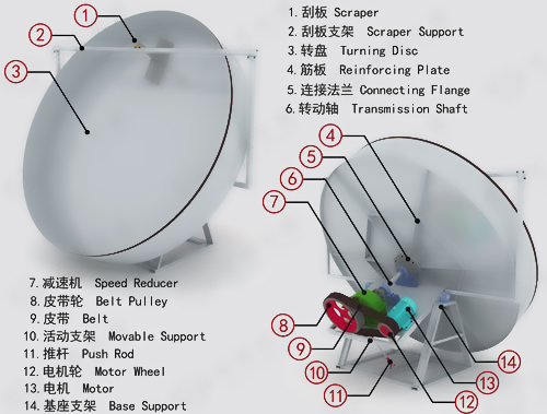 圓盤造粒機結構新穎合理,重量減輕,高度降低;工藝布置靈活方便,適合老廠改造。大盤傾角可調(diào)節(jié);采用角度墊片,調(diào)整靈活方便。采用獨特的無動力組合刮刀一體化使輔助功率消耗降低。大盤由盤體和盤節(jié)組成;降低主電機功率;盤節(jié)沿盤體可上下調(diào)節(jié);盤節(jié)端部為邊法蘭,料球出盤時可保證料球不被拉傷、撕裂。全新清淤設計,由無動力組合刮刀清邊清底,清角刮刀清盤角,配合盤體獨特處理技術,清淤、成球效果好,不會出現(xiàn)大泥團,料球直徑90%在3至5毫米。